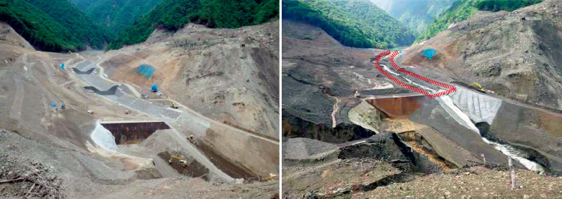 2012年6月,台風4号被災前と被災後の現場。完成間近の仮排水路が土砂で覆われた(赤い線は仮排水路があった箇所)