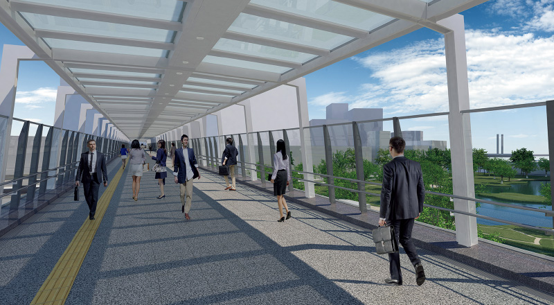 首都高速道路の上を越え,浜松町駅と竹芝ふ頭をフラットにつなぐ。浜松町駅3階レベルのアクセスは将来的に接続予定
