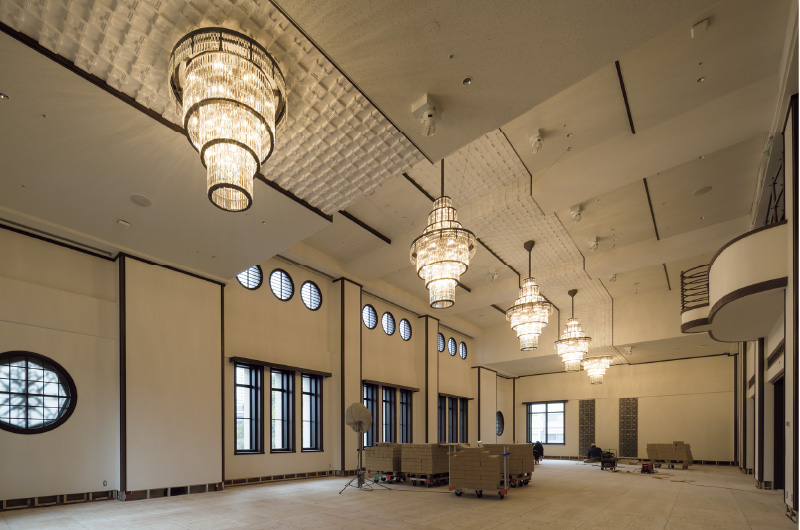シャンデリアも当時の竣工写真や報道写真を手掛かりに,デザインとサイズを再現