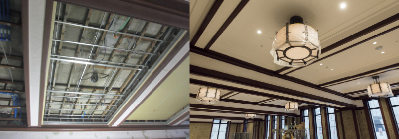 鳳凰の間(復原)の天井保存・補強改修の様子(左)と仕上げ(右)