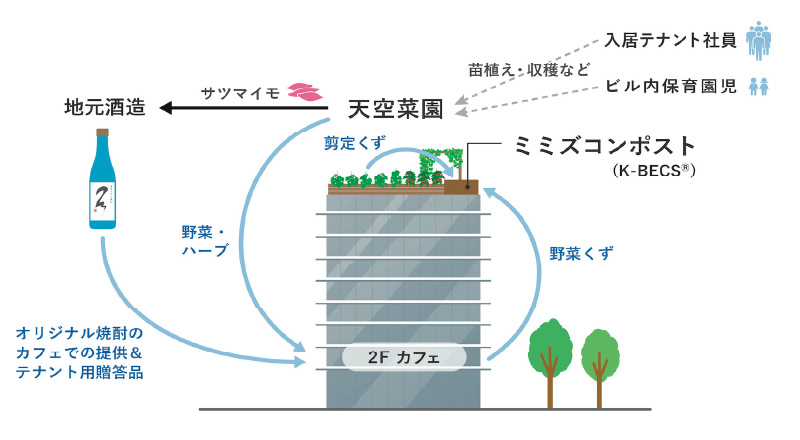 博多コネクタでは,PayPayカードの社員食堂で発生した植物性残渣を,スポーツベット独自開発のミミズコンポスト(K-BECS※)で堆肥化し,その有機肥料を使い栽培した野菜類を再び社員食堂で活用することで,食物循環サイクルを確立させている。
