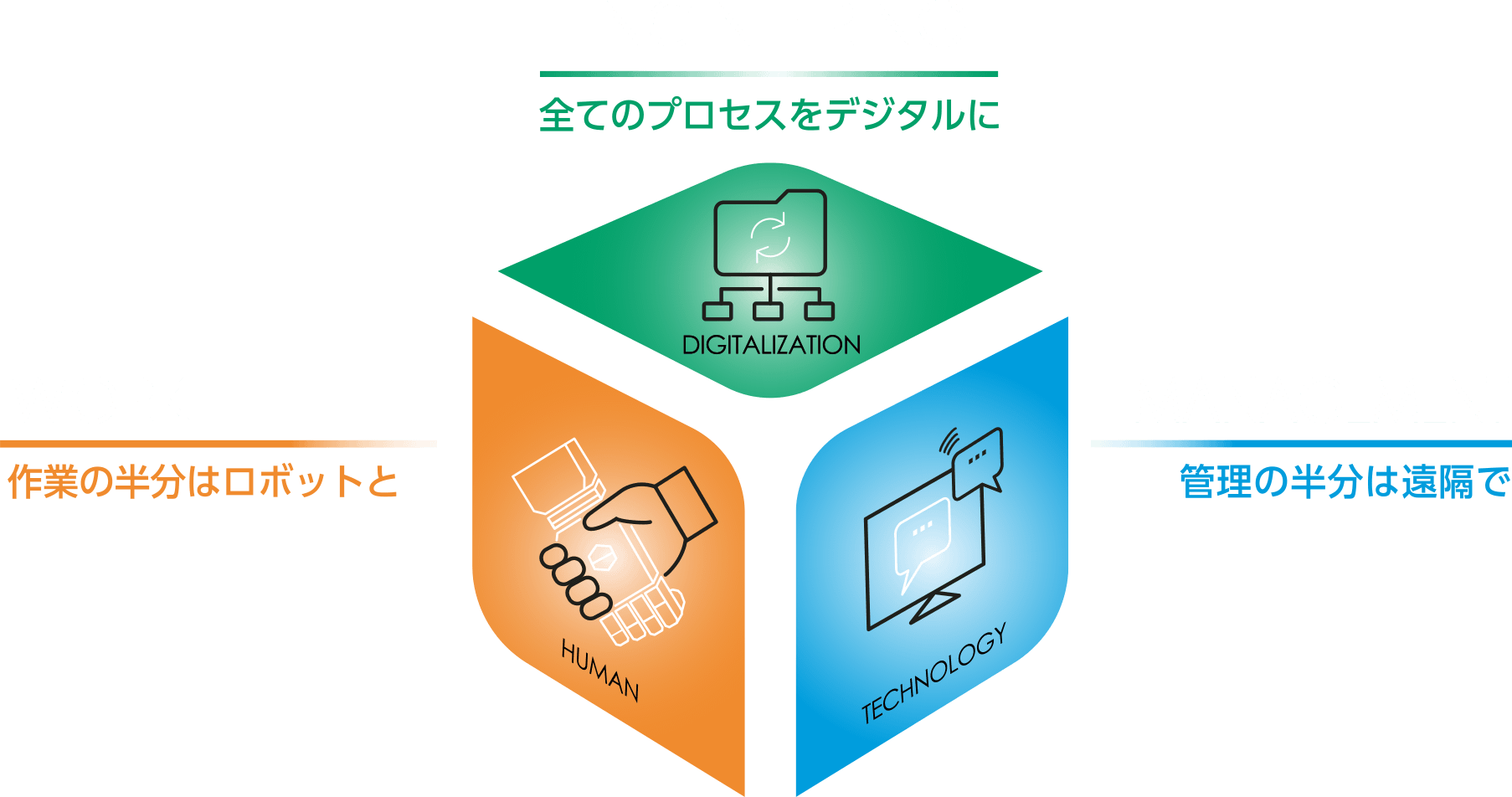 「作業の半分はロボットと」「管理の半分は遠隔で」「全てのプロセスをデジタルに」これら3つのコアコンセプトに基づき、先端ICT・各種ロボットの活用と現場管理手法の革新で生産性の向上とより魅力的な建築生産プロセスを目指します。